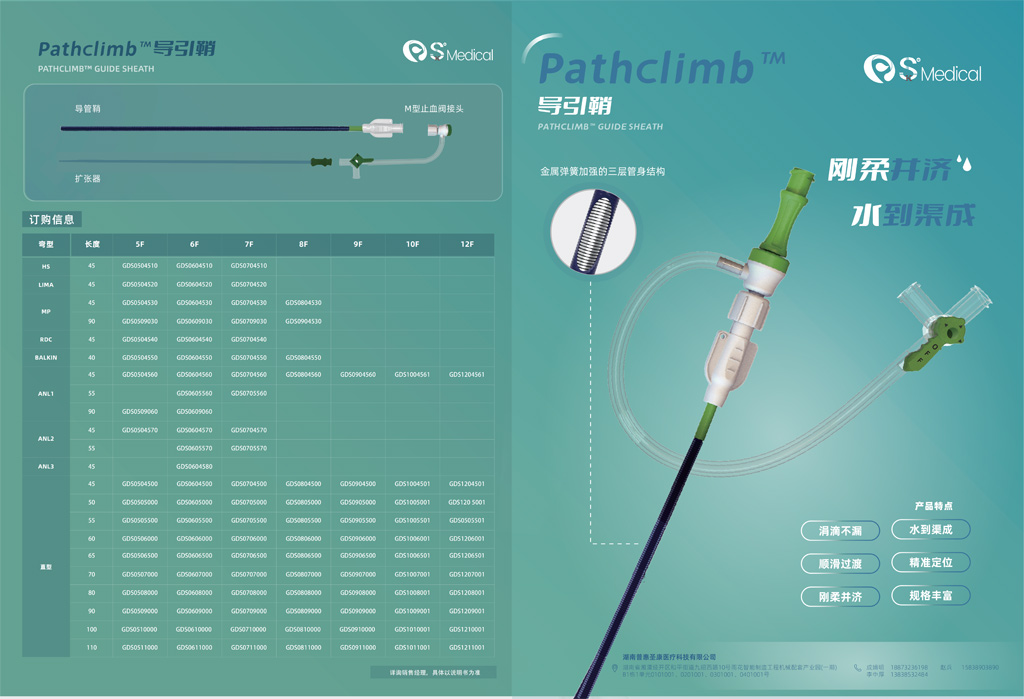 导引鞘由导管鞘、止血阀接头、扩张器组成,部分规格型号配备转换接头。导管鞘由管身和座组成,鞘管远端设有示标,导管鞘管身涂覆有亲水涂层。